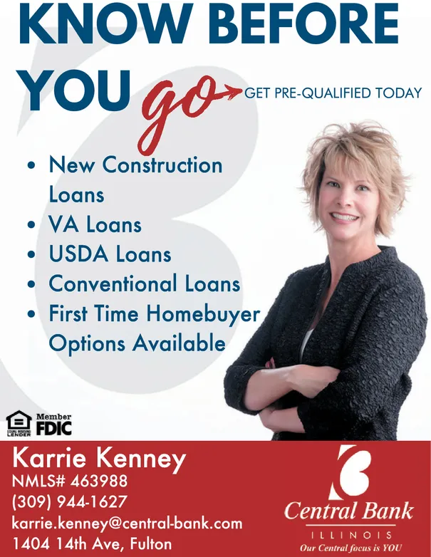 KNOW BEFORE YOU go GET PRE-QUALIFIED TODAY New Construction Loans VA Loans USDA Loans Conventional Loans First Time Homebuyer Options Available Member FDIC LENDER Karrie Kenney NMLS# 463988 (309) 944-1627 karrie.kenney@central-bank.com 1404 14th Ave, Fulton Central Bank ILLINOIS Our Central focus is YOU KNOW BEFORE YOU go GET PRE-QUALIFIED TODAY New Construction Loans VA Loans USDA Loans Conventional Loans First Time Homebuyer Options Available Member FDIC LENDER Karrie Kenney NMLS# 463988 (309) 944-1627 karrie.kenney@central-bank.com 1404 14th Ave, Fulton Central Bank ILLINOIS Our Central focus is YOU