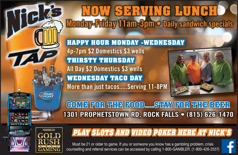 ic OW SERVING LUNCH Monday-Friday 11am-3pm Daily sandwich specials HAPPY HOUR MONDAY -WEDNESDAY 4p-7pm $2 Domestics $3 wells THIRSTY THURSDAY All Day $2 Domestics $3 wells WEDNESDAY TACO DAY TAP BUD GHT COME FOR THE FOOD... STAY FOR THE BEER 1301 PROPHETSTOWN.RD, ROCK FALLS . (815) 626-1470 ala. G01D RUSH POWERED BY PLAY SLOTS AND VIDEO POKER HERE AT NICK'S Must be 21 or older to game. If you or someone you know has a gambling problem, crisis GAMING counselling and referral services can be accessed by calling 1-800-GAMBLER. (1-800-426-2537)